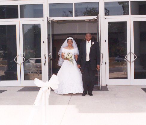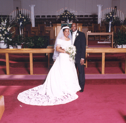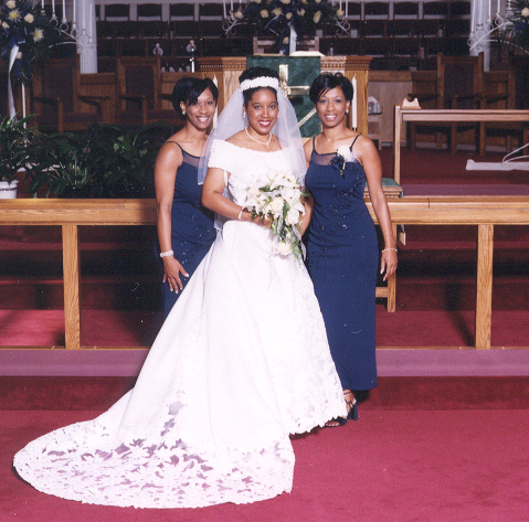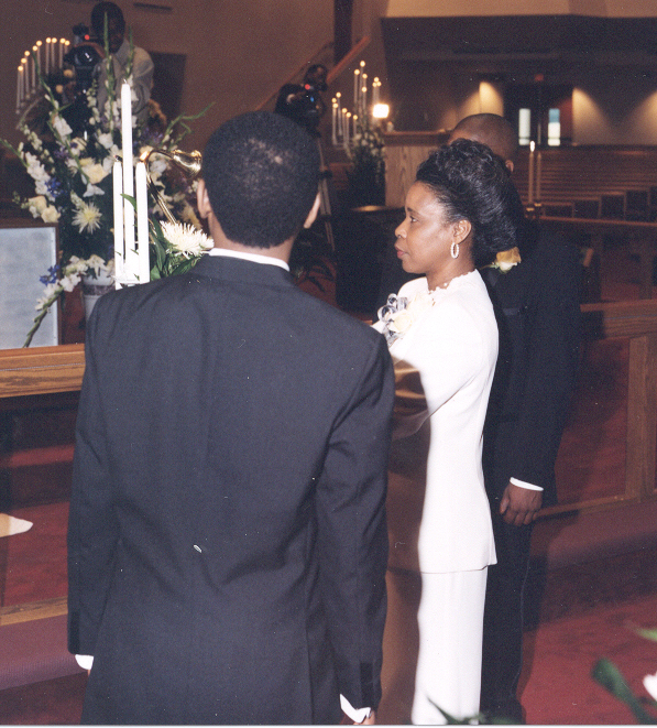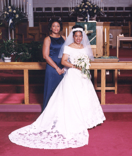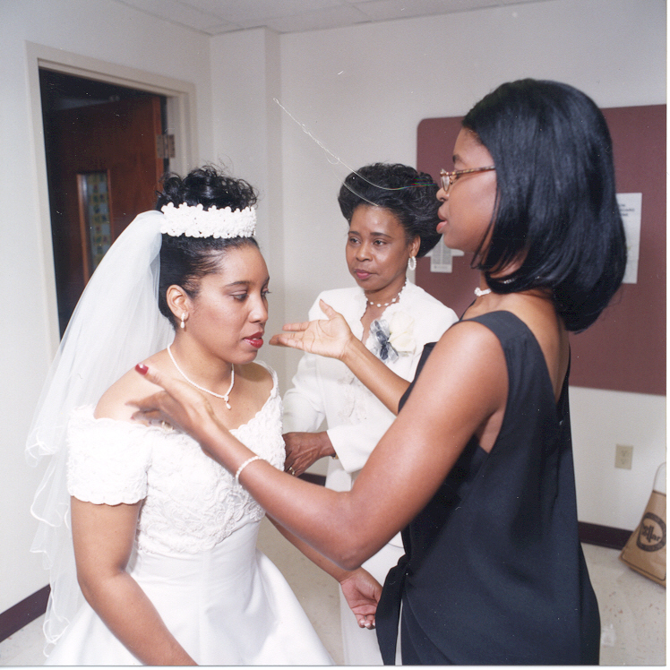 Minutes before the wedding: Hairstylist and make-up artist, Yolanda Dupree, applies finishing touches with the mother of the bride assisting (sort of). |